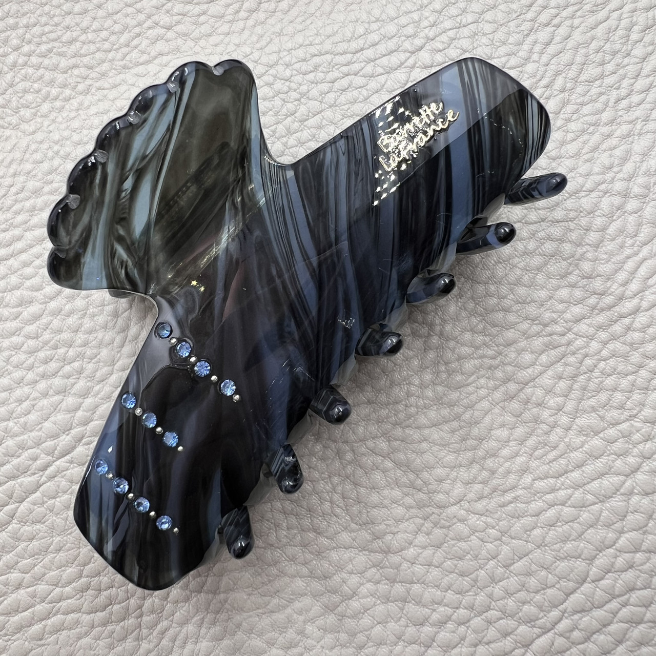 Краб для волосся міцний французький пластик чорного синього кольору в стразах із написом довжина 9.5 см висота 4.5 см
